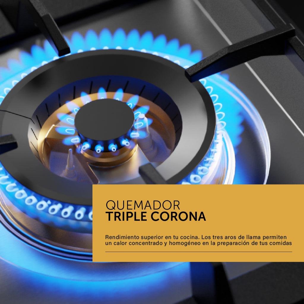 El encendido electrónico facilita el uso cotidiano, haciendo que poner en marcha tus preparaciones sea rápido y seguro. Además, los distintos tipos de quemadores te ofrecen la versatilidad que necesitás: desde el quemador auxiliar para preparaciones delicadas hasta el poderoso quemador triple corona, que concentra el calor de manera eficiente para cocciones intensas y rápidas. Los quemadores semi-rápidos completan una distribución perfecta del calor, dándote control total sobre tus recetas.