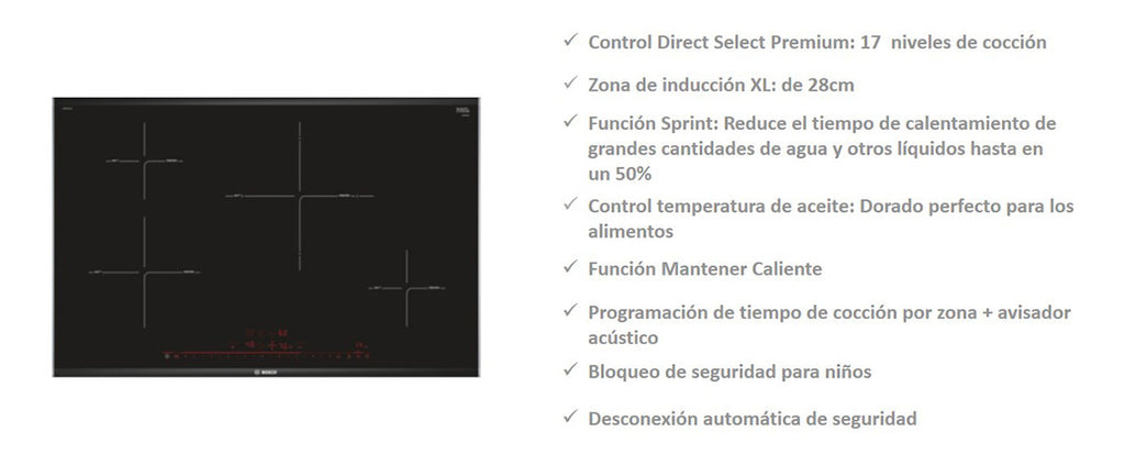 - Funciones: Inicio automático, sprint, memoria, mi consumo, mantener caliente, clean, comprobar recipiente, programación de tiempo de cocción en cada zona, cronómetro, bloqueo de seguridad para niños, indicador de calor residual y desconexión automática de seguridad del anafe