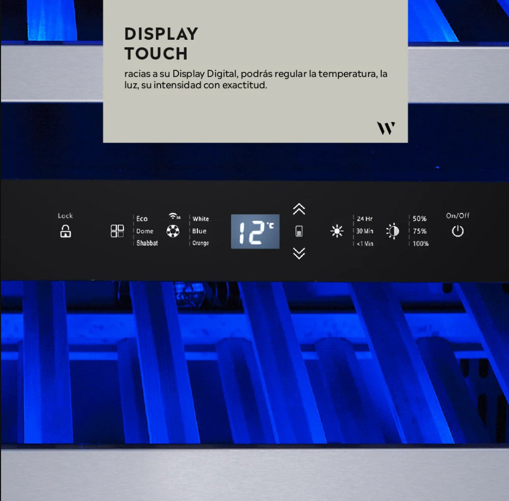 Las cavas premium de vinos Winefroz mantienen un equilibrio ideal entre temperatura, iluminación y humedad, elegir el modo de funcionamiento (Estándar/Eco/Shabbat) y seleccionar el tiempo de luz encendida, entre otras funciones.