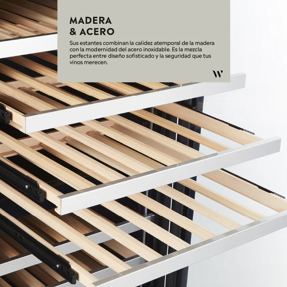 El modelo WMN38D, de doble temperatura, permite regularla entre 5ºC a 18ºC según el tipo de vino que desea conservar , tiene una capacidad para 46 botellas y cuenta con motor compresor.