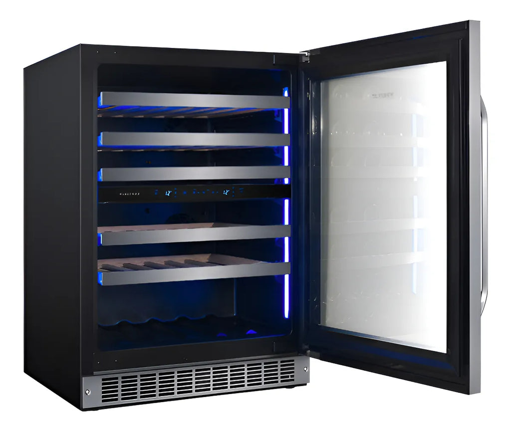 Sus estantes con rieles alemanes deslizables y su luz led perimetral hacen de tu cava el mejor estacionamiento para tus vinos!