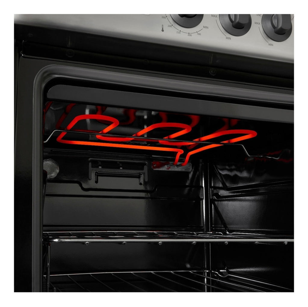 Esta cocina combina un diseño clásico en acero inoxidable con funciones prácticas que simplifican la preparación de alimentos en el día a día. La parrilla superior está construida con materiales resistentes que soportan ollas y sartenes de distintos tamaños, mientras que el horno de buena capacidad permite cocinar, hornear y asar con eficiencia.