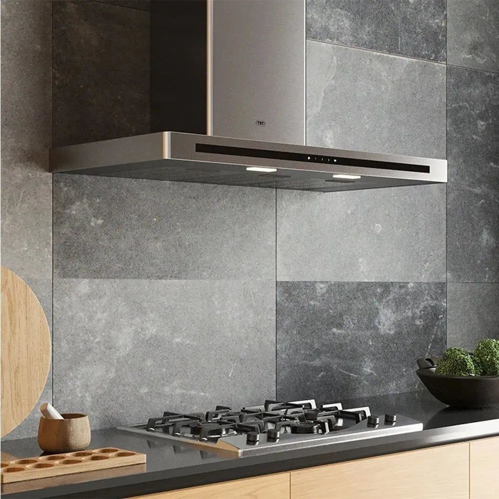 MODELO: CAMPANA TST DIAMANTE 90cm Ancho: 90cm Profundidad: 51cm Altura Total (con cubre caño incluido): 101cm Velocidades: 3 / Extracción: 800m3/h Características: Acero inoxidable esmerilado y detalle en vidrio negro, filtros metálicos lavables, cubre caño extensible hasta 95cm, luz LED, PANEL TOUCH. LUZ LED, TIMER PROGRAMABLE. Opcional (no incluido): Sin salida exterior.