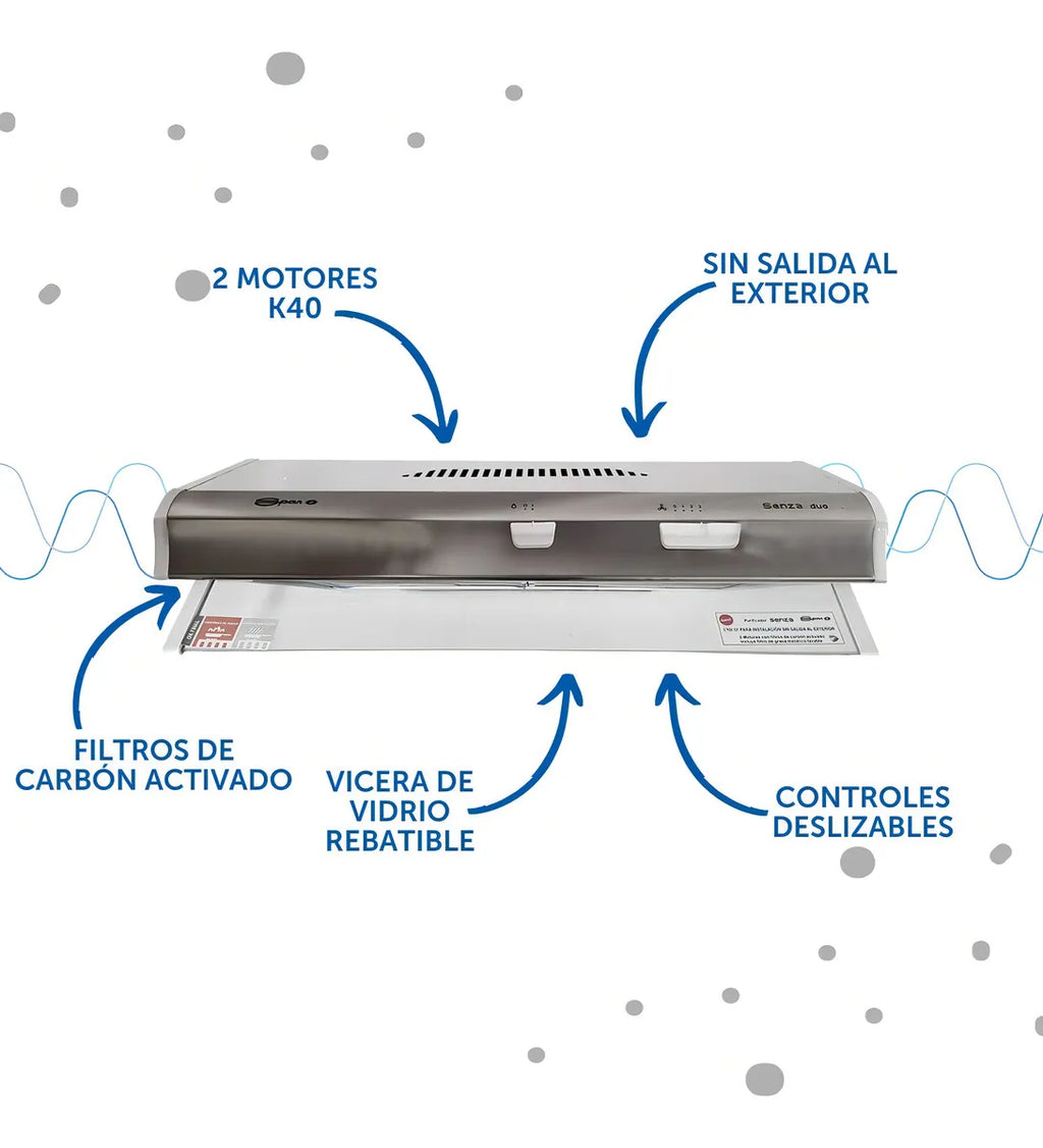 Spar es una marca consolidada en la creación de campanas y purificadores de calidad. Sus productos están diseñados con el objetivo de que cada cocina esté equipada con la última tecnología para satisfacer las necesidades de las personas en su hogar. Práctico y compacto Al ser empotrable, este producto permite ahorrar espacio y ofrece un estilo sofisticado.