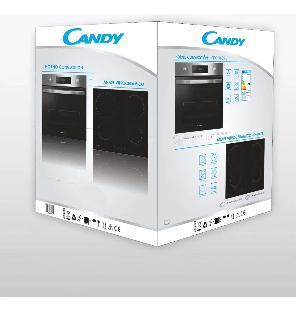Diseño elegante Al ser empotrable, este horno le brindará a tu cocina un estilo sofisticado y te dará la posibilidad de ahorrar más espacio. Tus recetas más sabrosas Lográ una cocción pareja en tus elaboraciones con su sistema por convección, que permite ahorrar tiempo y energía. HORNO ELÉCTRICO CANDY FIDC X605L Potencia: 2100 w. Capacidad 65 Lts. 8 funciones de cocción Timer touch. Lámpara. Ventilación tangencial asistida. 1 bandeja de 35 mm 2 rejillas. Dimensiones Altura: 595 mm Altura del compartimiento de instalación: 58,5 cm Ancho: 595 mm Ancho de compartimiento de instalación: 56 cm Profundidad: 567 mm Profundidad del compartimiento de instalación: 56 cm ANAFE VITROCERÁMICO CANDY CH64CCB 4 zonas de cocción Zona 1: 1200 W Zona 2: 2300 W Zona 3: 1800 W Zona 4: 1200 W Potencia máxima: 220-240 V. Control touch. Medidas: 4,6 x 59 x 52 cm. No incluye cable de alimentación. Origen Turquia