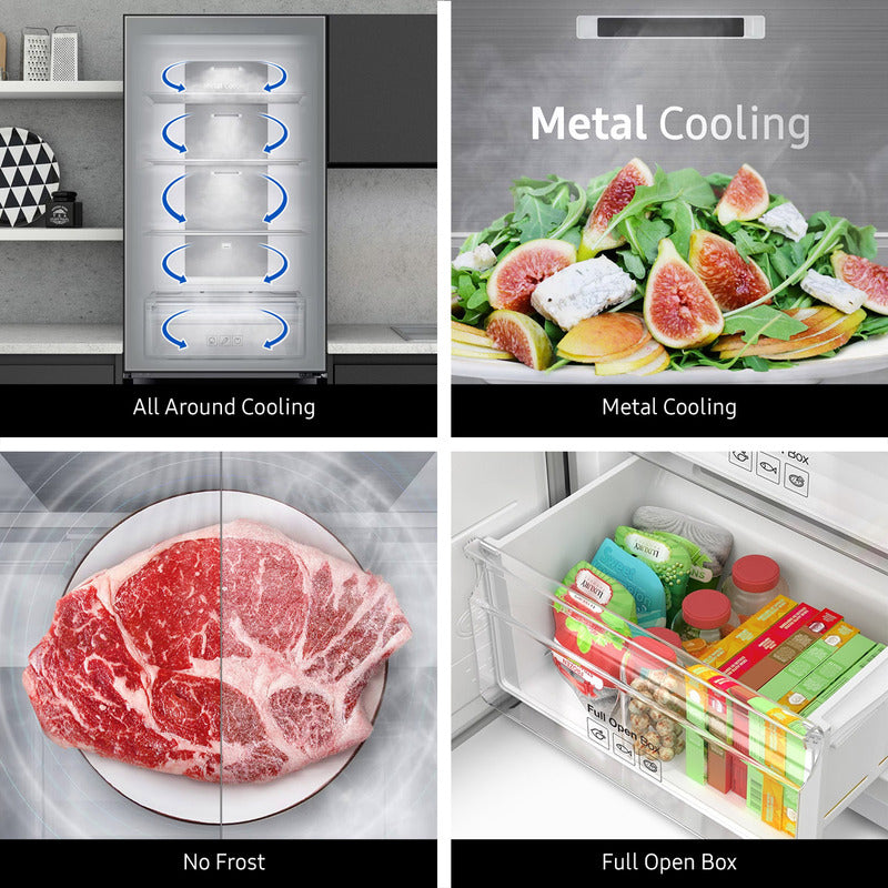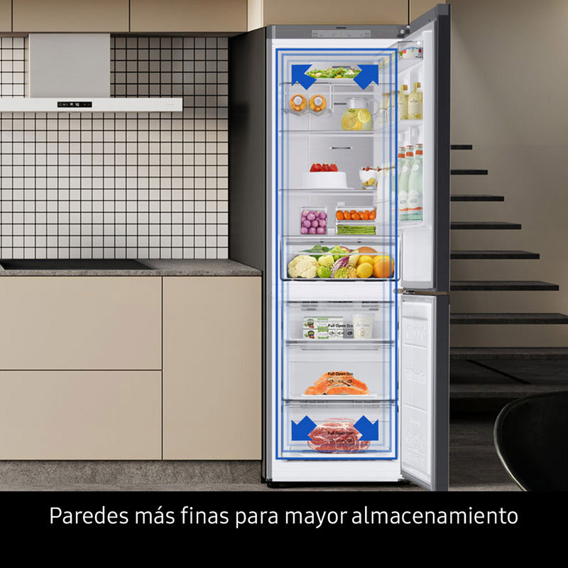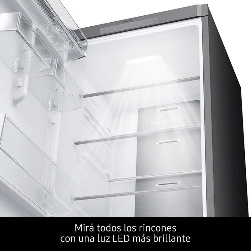 Disfrutá de tus alimentos frescos y almacenalos de manera práctica y cómoda en la heladera Samsung, la protagonista de la cocina. Comodidad para tu casa Su sistema no frost evita la generación de escarcha y te va a permitir conservar el sabor y las propiedades nutritivas de los productos. Frescura en tus alimentos Además, por su tecnología inverter esta heladera enfría tus comidas a través de un sistema inteligente con sensores que regulan la velocidad del motor, sosteniendo la temperatura en forma pareja en el interior. Eficiencia energética y utilidad Gracias a su eficiencia energética A+, vas a ahorrar en la economía de tu hogar y aprovechar al máximo su rendimiento, ya que cuenta con un 55% de ahorro de consumo. Practicidad interior