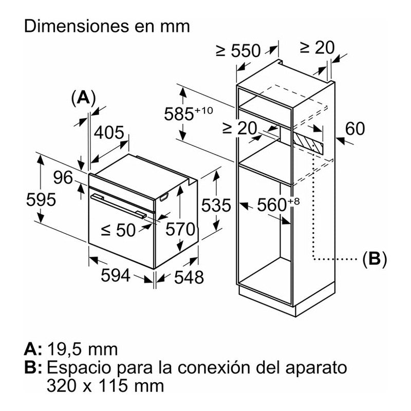ONLINESTORE GARANTIA OFICIAL Bosch Serie 4 HRA512ES0 Horno multifunción con vapor añadido El vapor evita que los alimentos se sequen, proporciona una corteza deliciosamente crujiente y mantiene el pan esponjoso por dentro; simplemente llene la cantidad solicitada de agua en el pequeño recipiente de agua extraíble y apto para lavavajillas que está integrado en la parte inferior del horno y configure el modo de calentamiento "vapor caliente" Recetas Gourmet: hasta 10 recetas preprogramadas; Simplemente seleccione el tipo de comida y el peso y disfrute. Resultados perfectos Pantalla LED con luz roja y controles que facilitan el uso del horno y el acceso a la información necesaria Control oculto, limpieza frontal fácil y cómoda. Características Técnicas Clase de eficiencia energética*: A. Horno multifuncional con vapor añadido. Asistente de limpieza de agua, limpieza hidrolitica Pantalla LED y controles ocultos. Recipiente de agua de 250 ml. Accesorios incluidos: depósito de agua, bandeja honda y parrilla. Dimensiones: 59,5 x 59,4 x 54,8 centímetros. Microondas Bosch BEL554MS0 Serie 6 Es un modelo integrable con grill, pensado para nichos de 38 cm. Tiene capacidad de 25 litros, potencia de hasta 900 W y 8 programas automáticos. Su diseño en acero inoxidable lo hace elegante y funcional en cocinas modernas. Características principales Tipo: Microondas integrable con grill Capacidad: 25 L Potencia microondas: 900 W 5 niveles de potencia: 90 W, 180 W, 360 W, 600 W, 900 W Potencia grill: 1,2 kW AutoPilot: 8 programas automáticos precargados 4 programas de descongelación + 3 programas microondas + 1 combinación micro + grill Función memoria: guarda 1 programa personalizado Comandos: mandos ocultables para fácil limpieza Display LED Interior: acero inoxidable Prato giratório: diámetro de 31,5 cm Dimensiones externas: 382 × 594 × 388 mm (alto × ancho × profundidad) Apertura de puerta: lado izquierdo Iluminación interna LED Seguridad: apagado automático, interruptor de contacto de puerta Potencia de conexión: 1,45 kW Tensión: 220-230 V Peso aproximado: 19 kg Accesorios incluidos: parrilla + plato giratorio