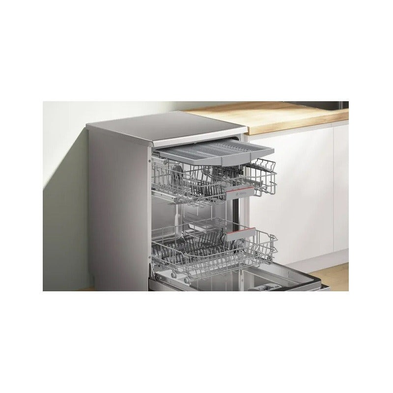 Lavavajillas Bosch Sms4emi06e Libre Instalacion 60cm 14 Cubiertos Inox 14 Cubiertos 6 Programas de lavado Detección automática de nivel de suciedad Tipo de instalación Independiente con posibilidad de encastre Tipo de construcción Libre instalación Acero cepillado antihuellas Color de panel de mandos Acero inoxidable cromo pintado Encimera extraíble Sí Opción de puerta panelable No Zócalo regulable No Clase de eficiencia energética (norma (UE) 2017/1369) B Consumo de energía de 100 ciclos del programa Eco (EU 2017/1369) 65 kWh Consumo de energía del programa eco en kWH por ciclo (EU 2017/1369) 0.645 kWh/cycle Consumo de agua del programa eco en litros por ciclo (EU 2017/1369) 9.0 l Clase de emisiones de ruido aéreo (EU 2017/1369) B Emisiones de ruido aéreo (EU 2017/1369) 42 Duración del programa (EU 2017/1369) 3:35 h Número máximo de cubiertos (EU 2017/1369) 14 Programas Eco, AUTOMATICO 45-65°C, intensivo, Rápido, Programa nocturno, Custom program Funciones adicionales Inicio remoto, EfficientDry, Media carga, SpeedPerfect Plus, Programa especial: limpieza de la cuba AquaStop: sistema antifugas Sí Sistema de secado Intercambiador de calor + asistente de secado Tipo de cestas Media Tercera bandeja Bandeja 1.0 Material de la cuba Acero inoxidable Aquasensor si Detergent detection si Motor EcoSilence si Display ext. tiempo restante, Alimentación de agua Motor EcoSilence si Seguro para niños bloqueo de teclas Temporizador en espera/red 2.0 min Dimensiones del aparato Ancho 60,0 cm Alto 84,5 cm Profundidad 60,0 cm Fondo con puerta abierta a 90 grados 115,5 cm Altura de la encimera extraíble 3,0 cm Peso 52,2 Kg Origen Polonia