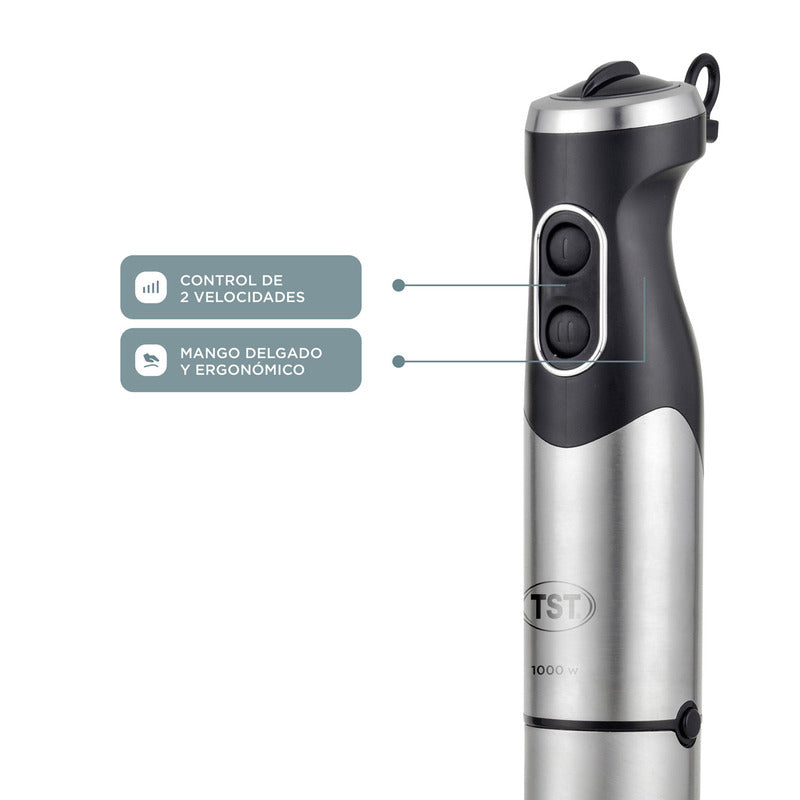 La Licuadora de mano 3 en 1 TST 930 es el aliado perfecto para quienes buscan versatilidad y potencia en su cocina. Con 1000 W de potencia y dos velocidades, esta licuadora no solo es ideal para batidos y bebidas saludables, sino que también es perfecta para mezclar ingredientes y preparar comidas caseras. Diseñada con un mango ergonómico y un eje de acero inoxidable, esta herramienta facilita el uso prolongado sin esfuerzo, garantizando una experiencia cómoda y eficiente. Sus cuchillas de acero inoxidable aseguran un rendimiento superior en la trituración de hielo y la licuación, proporcionando resultados homogéneos en cada preparación. Incluye prácticos accesorios como un picador y un vaso medidor, que le permitirán explorar una variedad de recetas con facilidad. Su diseño en color plateado no solo es atractivo, sino que también destaca en cualquier cocina moderna. Aquellos que deseen mejorar su estilo de vida saludable encontrarán en la Licuadora de mano TST 930 una opción excepcional para preparar batidos nutritivos y comidas deliciosas en un abrir y cerrar de ojos. Elegir esta licuadora es optar por calidad, durabilidad y funcionalidad en cada uso.