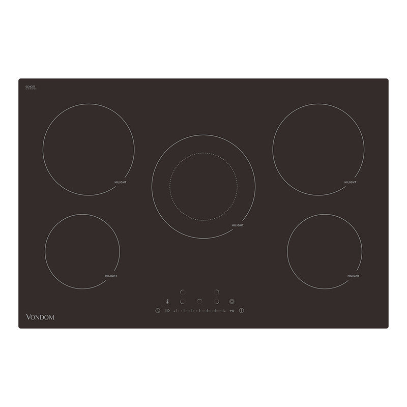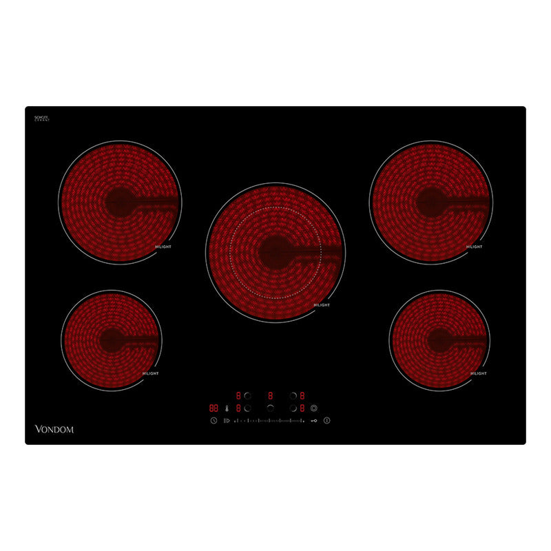 Anafe Eléctrico Vitrocerámica Empotrable Vondom - 77 cm Nuestro anafe de vitrocerámica está diseñado para ofrecerte una experiencia gastronómica superior. Con su elegante diseño y tecnología avanzada, este anafe se convierte en el aliado perfecto para tus preparaciones diarias. Transformá tu cocina y disfrutá de la máxima comodidad con nuestro anafe eléctrico de vitrocerámica empotrable Vondom. Con pantalla táctil y 9 niveles de potencia, controlá cada cocción con precisión. Las 5 zonas de cocción, su potencia de 8200W y la zona dual te permite cocinar varios platos al mismo tiempo, optimizando tu tiempo en la cocina. El temporizador inteligente , el apagado de seguridad , el bloqueo para niños y la alerta de calor residual , garantizan una cocina segura y funcional. Además, cuenta con vidrio Schott Ceran , conocido por su durabilidad, conductividad térmica y eficiencia energética. Este anafe de 77 cm se integra perfectamente en cualquier cocina, aportando funcionalidad y estilo. Elegí nuestro anafe y disfrutá de una cocina moderna y eficiente, creando momentos inolvidables. Características principales: - 5 zonas de cocción - Vidrio "Schott Ceran" - 9 niveles de potencia - Display touch - Timer inteligente - Apagado de seguridad - Bloqueo para niños - Alerta de calor residual - Zona dual Características técnicas: - Voltaje: 220-240 Vca - Frecuencia: 50/60 Hz - Potencia: 8200 W - Clase climática: I Medidas del producto: - Ancho: 77 cm - Alto 5 cm - Profundidad: 52 cm Medidas de embalaje: - Ancho: 84,5 cm - Alto: 13,5 cm - Profundidad: 62 cm Peso neto: 10,3 kg / Peso bruto: 12,2 kg