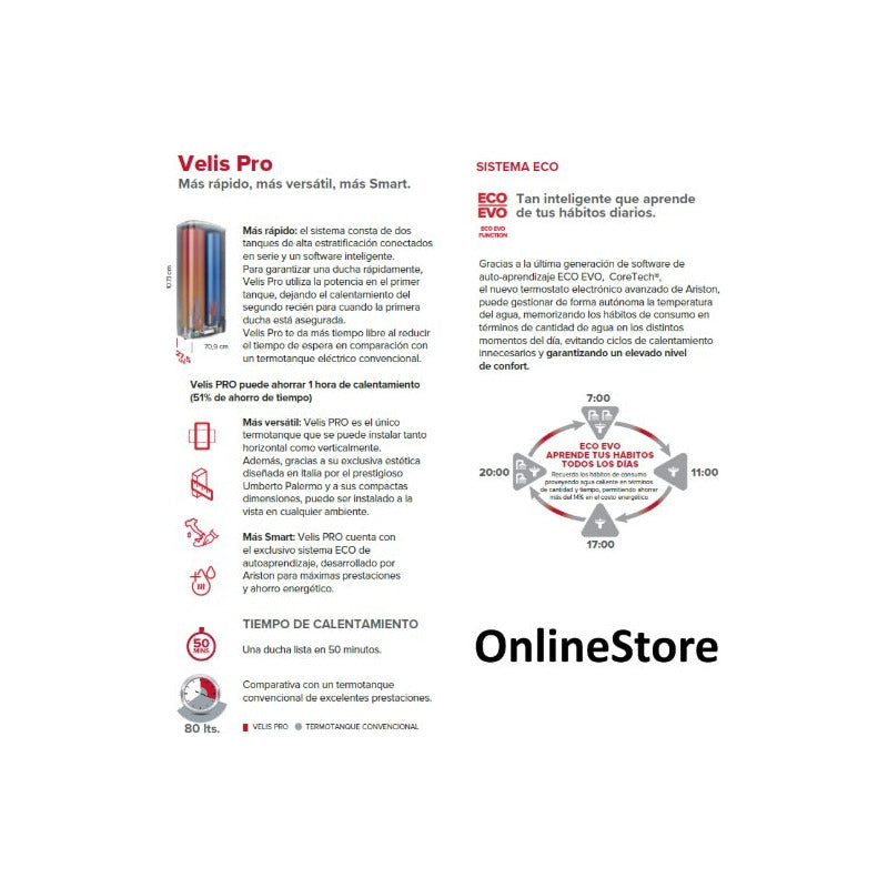 TERMOTANQUE 80 lts ELÉCTRICO MULTIPOSICIÓN ARISTON VELIS PRO CONFORT • El calentador de agua más plano en un diseño refinado • Reducción del tiempo de espera en un 60% • Aislamiento de poliuretano de alto espesor • Panel frontal de control LED con termómetro inteligente EFICIENCIA Y AHORRO DE ENERGÍA • Ahorro de energía gracias a la función ECO • Termostato electrónico CARACTERISTICAS ADICIONALES • Absolute Bodyguard System: sistema de seguridad electrónico • Titanio esmaltado • Instalación multiposición APLICACIONES • Viviendas de uso permanente VENTAJAS Alto 1071mm x 709mm ancho x 275mm profundidad Diseño exclusivo Sistema Nanomix Gran cantidad de agua caliente (15 litros extra a temperatura de mezcla) Aislación térmica de poliuretano expandido de alta densidad libre de cfc Termómetro inteligente que proporciona una visualización confiable ALTA EFICIENCIA Producto caracterizado por una alta eficiencia energética, reducción del consumo energético y de las emisiones contaminantes MADE IN ITALY Producto fabricado en Italia. DIMENSIONES REDUCIDAS Volumen reducido para una fácil instalación MULTIPOSITION (NL) Consente di essere installato sia in orizzontale che in verticale TITANIUM PLUS Calderín esmaltado al titanio con un tratamiento especial a 850°C ECO Permite la reducción de los consumos memorizando la necesidad de cada usuario DISPLAY ECO Interfaz frontal a leds con termómetro electrónico inteligente NANOMIX Más cantidad de agua caliente disponible gracias a deflectores especiales ITALIAN DESIGN Calidad italiana garantizada SHOWER READY (NL) Garantisce la prima doccia calda nella metà del tempo. ABS Sistema de total seguridad electrónica.
