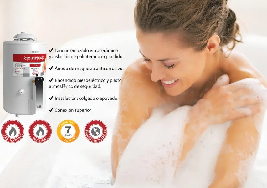 El Termotanque a Gas Coppens TTQ50 de 50 litros con recuperación simultánea es una solución compacta, eficiente y confiable para el suministro de agua caliente sanitaria en hogares pequeños o departamentos. Este modelo está diseñado para ofrecer agua caliente continua sin interrupciones, permitiendo su uso simultáneo en diferentes salidas sin demora notable en la recuperación térmica.